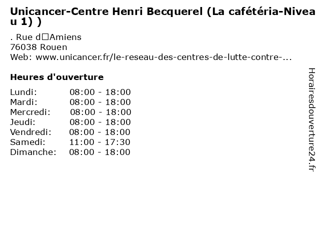 1 Unicancer-Centre Henri Becquerel (Horaires des visites) (Distance: 0,00 km) . Rue d’Amiens, 76038 Rouen becquerel, cancer, centre, clinique, des, henri, horaires, hôpitaux, santé, services, unicancer, visites 2 Unicancer-Centre Henri Becquerel (Distance: 0,00 km) . Rue d’Amiens, 76038 Rouen becquerel, cancer, centre, clinique, henri, hôpitaux, santé, services, unicancer 3 Crèche d'entreprise Centre Henri Becquerel (Distance: 0,00 km) n/a Rue d'Amiens, 76000 Rouen becquerel, caregivers houses, centre, child care, crèche, d'entreprise, family home, henri, home care, kindergartens, micro-nurseries, parental home 4 Centre Henri Becquerel (Rouen) (Distance: 0,00 km) . Rue d'Amiens, 76038 Rouen becquerel, centre, docteur, henri, medecins, rouen, sante 6 Dr Henri Gonde - Pharmacien hospitalier (Distance: 0,35 km) 37 boulevard Gambetta, 76000 Rouen cachet, charles, de, dr, gonde, henri, hospitalier, hôpital, medicament, nicolle, pharmacie, pharmacien, rouen |