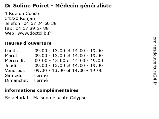 1 Dr Soline Poiret - Médecin généraliste (Distance: 22,11 km) 11 Rue de Caudejo, 34460 Cessenon-sur-Orb docteur, dr, generaliste, généraliste, medical, médecin, poiret, soin, soline 3 Dr Matthieu Deshayes - Médecin généraliste (Distance: 0,00 km) 1 Rue du Coustel, 34320 Roujan consultation, deshayes, docteur, dr, généraliste, matthieu, med, médecin, médecine, secrétariat, traitement 4 Dr Jérôme Arqué - Médecin généraliste (Distance: 8,13 km) 1 Rue de la Paix, 34480 Magalas arqué, consultation, docteur, dr, généraliste, jérôme, med, médecin, médecine, secrétariat, traitement 5 Dr Laura Blanchard - Chirurgien-dentiste - secrétariat (Distance: 8,23 km) 20 Avenue du Capitaine Bonnet, 34480 Magalas blanchard, chirurgien, chirurgien-dentiste, dentiste, dr, laura, médecins, médicaments, santé, secrétariat, spécialiste 6 Pezenas - Pédiatrie (secrétariat) (Distance: 9,03 km) 4 Av Paul Vidal De la Blache, 34120 Pezenas consultation, docteur, pezenas, pédiatrie, santé, secrétariat |