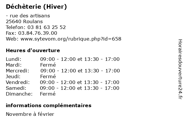 1 Déchèterie (Hiver) (Distance: 6,91 km) - du Chenil, 25360 Bouclans bennes, débarras, déchèterie, détritus, hiver, ordures 2 Déchèterie (Hiver) (Distance: 8,29 km) - lieu-dit aux Planches de Cromary, 25640 Marchaux bennes, débarras, déchèterie, détritus, hiver, ordures 3 Déchèterie (Hiver) (Distance: 9,18 km) - Rue des Bouvreuils, 25110 Baume-les-Dames bennes, débarras, déchèterie, détritus, hiver, ordures 4 Déchèterie (Hiver) (Distance: 13,33 km) - Rue du Lac, 25660 Saône bennes, débarras, déchèterie, détritus, hiver, ordures, poubelles 5 Déchèterie (Hiver) (Distance: 16,87 km) - Rue de Sodetal, 25870 Devecey bennes, débarras, déchetterie, déchèterie, détritus, hiver, ordures 6 Déchèterie (Hiver) (Distance: 19,82 km) - Rue des Banardes, 25800 Valdahon bennes, débarras, déchèterie, détritus, hiver, ordures |