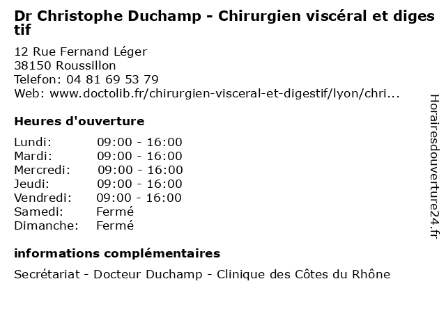 1 Dr François Cadi - Chirurgien viscéral et digestif (Distance: 0,33 km) - rue Fernand-Léger, 38150 Roussillon cadi, chirurgien, consultation, digestif, docteur, dr, et, françois, med, médecin, médecine, traitement, viscéral 3 Roux Christophe (Distance: 8,44 km) Le Mermoz, 38370 Saint Clair Du Rhone boucheries, christophe, poissonneries, roux 4 Mercoeur Eric Christophe Roger (Distance: 11,88 km) L Isle Eau Gourmands, 42410 Pelussin christophe, eric, mercoeur, restaurants, roger 5 Domaine Billon Christophe (Distance: 13,15 km) 115 chemin des Corendies, 69420 Ampuis alcool, billon, blanc, bordeaux, caviste, champagne, christophe, domaine, vignobles, vins 6 Dr Christophe Onimus - Chirurgien-dentiste (Distance: 16,52 km) 30 Avenue Général Leclerc, 38200 Vienne chirurgien, christophe, dentaire, dentiste, dr, implantologie, onimus, parodontologie |