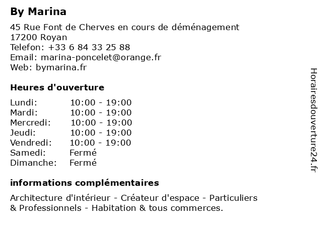 2 Vival By Casino (Distance: 3,02 km) 2 Avenue de Suzac, 17110 Saint-Georges-de-Didonne alimentation, by, casino, distributeur alimentaire, supermarché, supérette, vival, épicerie 3 Coiffure Marina (Distance: 3,26 km) 29 Rue Jean-Pierre Coulon, 17110 Saint-Georges-de-Didonne coiffure, marina 4 Isla Marina (Distance: 3,36 km) 1 b Rue Henri Collignon, 17110 St Georges De Didonne isla, marina, restaurants 5 ConceptStore By Angélique (Distance: 3,59 km) 19 Rue Gambetta, 17200 Royan accessoires, angélique, boutique, by, cadeaux, conceptstore, habillement, maison, mode 6 Vival by Casino (Distance: 3,77 km) 11 Place Robert Schuman, 17200 Royan by, casino, droguerie, d’hypermarchés, frais, fruits et légumes, hygiène, parfumerie et autres produits non alimentaires., surgelés, vival, épicerie |