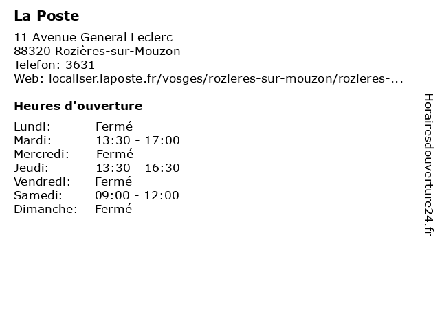 1 La Poste (Distance: 4,60 km) 8 Rue des François, 88320 Damblain express chronopost, la, poste, réexpédition internationale 2 La Poste (Distance: 6,09 km) 14 Place du Général Leclerc, 88140 Vrécourt agence, assurance, banque, banque postale, bureau de poste, chronopost, colis, courrier, dps, expéditions internationales, la, point, postale, poste, relais, timbres, téléphonie, ups, western union 3 La Poste (Distance: 8,01 km) 2 Rue de Bellune, 88320 Lamarche express chronopost, la, poste, réexpédition internationale 4 La Poste (Distance: 8,37 km) 4 Rue de la Corvée, 88140 Saint-Ouen-lès-Parey agence, colis, courriers, expédition, la, postale, poste, relais 5 La Poste (Distance: 9,00 km) 5 Place des Vosges, 88320 Martigny-les-Bains agence, colis, courriers, expédition, la, postale, poste, relais 6 La Poste (Distance: 14,63 km) 244 Grand Rue, 88320 Isches express chronopost, la, poste, réexpédition internationale |