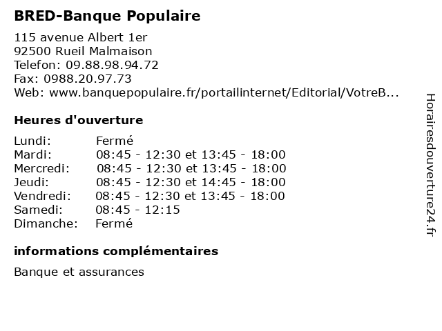 1 BRED-Banque Populaire (Distance: 1,20 km) 10 rue Maurepas, 92503 Rueil Malmaison banque, bred, populaire 2 BRED-Banque Populaire (Distance: 5,33 km) 17-21 avenue du Mal Joffre, 92380 Garches banque, bred, populaire 3 BRED-Banque Populaire (Distance: 9,96 km) 35 rue de la République, 92190 Meudon banque, bred, populaire 4 BRED-Banque Populaire (Distance: 10,09 km) 26 rue Marceau, 92130 Issy les Moulineaux banque, bred, populaire 5 BRED-Banque Populaire (Distance: 12,20 km) 19-23 avenue Gabriel Péri, 93400 St-Ouen banque, bred, populaire 6 BRED-Banque Populaire (Distance: 14,25 km) 32 boulevard Jules Guesde, 93200 St-Denis banque, bred, populaire |