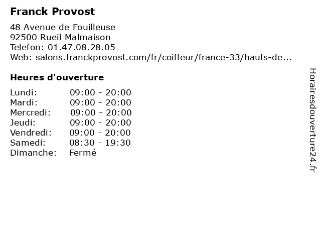 1 Franck Provost (Distance: 1,68 km) 20 Rue du Chateau, 92500 Rueil Malmaison expertise beauté, franck, la marque, provost, tendance coiffure, événement 2 Franck Provost (Distance: 2,12 km) 173 Grande Rue, 92380 Garches beauté, cheveux, coiffure, franck, provost, salon, service 3 Franck Provost (Distance: 3,20 km) 14 Rue Maurice Thorez, 92000 Nanterre beauté, cheveux, coiffure, franck, provost, salon, service 4 Franck Provost (Distance: 3,83 km) 18 Rue de Saint Cloud, 92410 Ville D'Avray beauté, cheveux, coiffure, franck, provost, salon, service 5 Franck Provost (Distance: 4,47 km) 15 Parvis de la Défense, 92092 Paris La Défense chaussures, franck, lingerie, mode enfant, mode femmes, mode hemmes, provost, sport 6 Franck Provost (Distance: 5,49 km) 17 PLACE DU MARÉCHAL JUIN,, 78800 MAISON LAFITTE expertise beauté, franck, la marque, provost, tendance coiffure, événement |