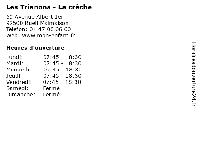 1 Les Trianons - La halte garderie (Distance: 0,00 km) 69 Avenue Albert 1er, 92500 Rueil Malmaison caregivers houses, child care, family home, garderie, halte, home care, kindergartens, la, les, micro-nurseries, parental home, trianons 2 Crèche People and Baby - Crèche municipale Les Trianons (Distance: 0,00 km) 69 avenue Albert 1er, 92500 Rueil Malmaison and, baby, crèche, crèches, garde d'enfants, les, les services parentalité, municipale, people, projet social, projet éducatif, trianons 3 École élémentaire publique Les Trianons (Distance: 0,14 km) 15 Rue Cramail, 92500 Rueil-Malmaison cours, les, publique, servicios, trianons, école, élémentaire 4 École élémentaire publique Les Trianons (Distance: 0,14 km) 15 Rue Cramail, 92500 Rueil-Malmaison cours, education, les, publique, services, trianons, École, école, élémentaire 5 Yespark, location de parking au mois - École primaire Les Trianons - rue Pereire - Rueil-Malmaison. (Distance: 0,52 km) 12 Rue Pereire, 92500 Rueil-Malmaison au, de, les, location, malmaison., mois, parking, pereire, primaire, rue, rueil, trianons, yespark, école 6 Mon-enfant.fr - Crèche familiale (Distance: 6,20 km) 19 Bailly, 92200 Neuilly Sur Seine caregivers houses, child care, crèche, enfant.fr, familiale, family home, home care, kindergartens, micro-nurseries, mon, parental home |