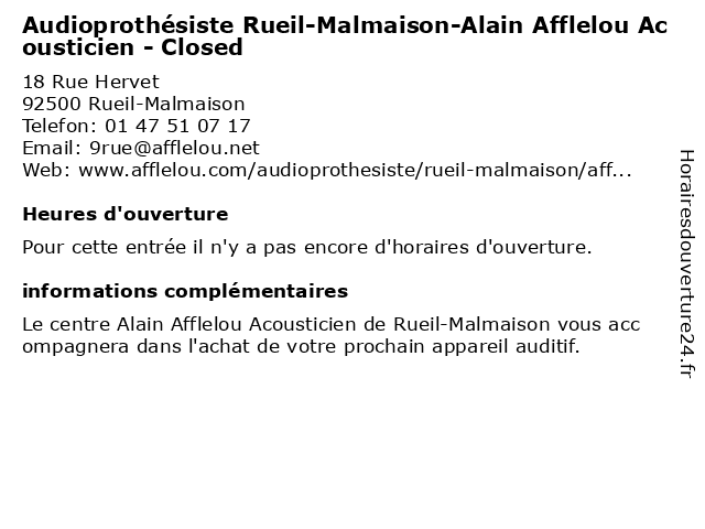 Termes de recherche pour Audioprothésiste Rueil-Malmaison-Alain Afflelou Acousticien - Closed:alain, afflelou, rueil, acousticien, malmaison, audioprothésiste, closed, audiologie, clinique médicale |