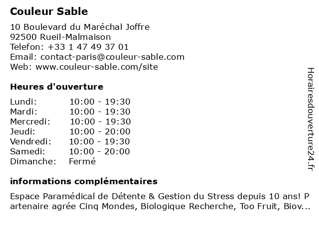 1 Intermède Couleur & Création Formul Coupe (Distance: 4,46 km) 16 avenue joffre, 92380 Garches cheveux, coiffeur, couleur, coupe, création, formul, intermède 2 Couleur Du Temps (Distance: 5,98 km) 84 Rue du Château, 92100 Boulogne-Billancourt beauté, coiffure, couleur, du, esthétique, salon, santé, temps 4 Cali en Couleur (Distance: 8,04 km) 24 rue Longchamp, 75116 Paris cali, couleur, en, manucure, pedicure 5 Gout Et Couleur (Distance: 10,53 km) 14 Rue De Bellechasse, 75007 Paris boulangeries, couleur, détail, gout 6 Couleur Café (Distance: 10,59 km) 60 rue de Sèvres, 75007 Paris bar, boissons, burger, café, couleur, fastfood, frites, restaurant |