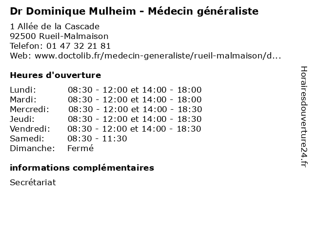 | Lundi | 08:30-12:00 et 14:00-18:00 |