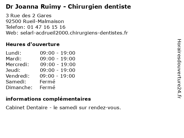 1 Dr Emilio Ruimy - Chirurgien dentiste (Distance: 0,00 km) 3 Rue des 2 Gares, 92500 Rueil-Malmaison chirurgien, dentaire, dentiste, dr, emilio, implantologie, parodontologie, ruimy 2 Maître Joanna Chamberland - Avocate (Distance: 5,25 km) 6 Place de la Pyramide, 92800 Puteaux avocate, avocats, chamberland, civils, droits, joanna, juridiques, maître 3 Dr Joanna Scheire - Chirurgien-dentiste (Distance: 6,79 km) 4 Rue Mugnier, 78600 Maisons-Laffitte chirurgien, dentaire, dentiste, dr, implantologie, joanna, parodontologie, scheire 4 Dr.Joanna Goldman- Dermatologie (Distance: 8,10 km) 3 Rue Barbès, 92300 Levallois Perret dermatologie, docteur, dr.joanna, goldman, medecins, sante 5 Maître Joanna Wereda - Avocate (Distance: 8,25 km) 61 Rue de Villiers, 92200 Neuilly-sur-Seine avocate, avocats, civils, droits, joanna, juridiques, maître, wereda 6 Joanna Cempla - Masseur-kinésithérapeute (Distance: 9,52 km) 159 Avenue de Verdun, 92190 Meudon cempla, joanna, kiné, kinésithérapeute, masseur, rééducation, soin |