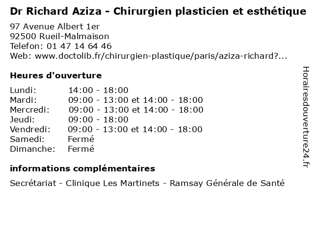 1 Dr Richard Aziza - Chirurgien plasticien et esthétique (Distance: 8,60 km) 13 Avenue d'Eylau, 75116 Paris aziza, chirurgien, consultation, docteur, dr, esthétique, et, med, médecin, médecine, plasticien, richard, secrétariat, traitement 2 Dr Jean-Philippe Binder - Chirurgien plasticien et esthétique - secrétariat (Distance: 0,00 km) 97 Avenue Albert 1er, 92500 Rueil-Malmaison binder, chirurgien, consultation, docteur, dr, esthétique, et, jean, med, médecin, médecine, philippe, plasticien, secrétariat, traitement 3 Dr Myriam Dallaserra - Chirurgien plasticien et esthétique (Distance: 0,00 km) 97 Avenue Albert 1er, 92500 Rueil-Malmaison chirurgien, clinique, dallaserra, de, docteur, dr, esthétique, et, générale, les, martinets, myriam, nucleaire, plasticien, privée, radioactives, ramsay, sante, santé 4 Dr Philippe Richard - Gastro-entérologue et hépatologue (Distance: 0,81 km) 97 Avenue Albert 1er, 92500 Rueil-Malmaison consultation, docteur, dr, entérologie, entérologue, et, gastro, hépatologue, philippe, richard, santé 5 Dr Richard Traube - Chirurgien-dentiste (Distance: 1,93 km) 16 Avenue du Maréchal Joffre, 92000 Nanterre chirurgien, dentiste, dr, médecin, médecine, médical, pharmaceutique, richard, traitement, traube 6 Sainsard Richard Eugene (Distance: 2,06 km) 73 Rue Emile Augier, 92500 Rueil Malmaison eugene, restaurants, richard, sainsard |