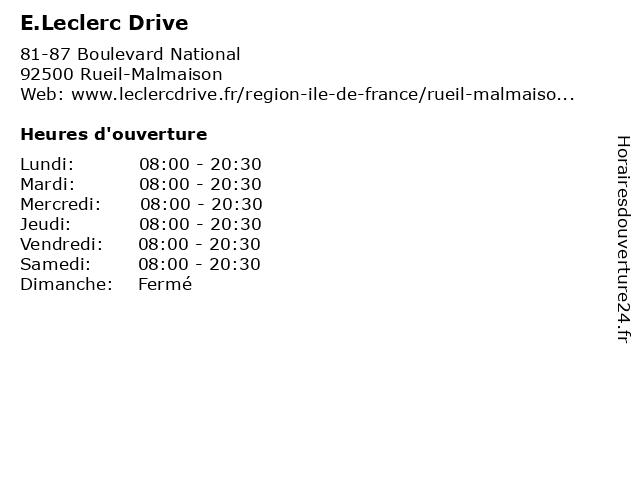 1 E.Leclerc Drive (Distance: 1,91 km) 270 Avenue Bonaparte, 92500 Rueil-Malmaison alimentation, distributeur alimentaire, drive, e.leclerc, grande surface, hypermarché, supermarché, supérette, épicerie 2 E.Leclerc Drive (Distance: 7,77 km) 21 rue Jules Michelet, 92700 Colombes alimentation, drive, e.leclerc, supermarché 3 E.Leclerc Drive (Distance: 12,52 km) 10 Rue des Communes, 78260 Achères discount, drive, e.leclerc, marché, supermarché 4 E.Leclerc Drive (Distance: 12,94 km) 80 Avenue de la libération, 95220 Herblay discount, drive, e.leclerc, marché, supermarché 5 E.Leclerc Drive (Distance: 14,75 km) 77 Rue d'Ermont, 95390 Saint-Prix alimentation, drive, e.leclerc, supermarché 6 E.Leclerc Drive (Distance: 15,18 km) 6 rue Leonardo Da Vinci, 78700 Conflans-Sainte-Honorine alimentation, drive, e.leclerc, supermarché |