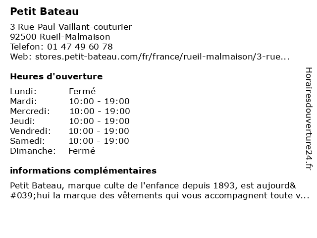 1 Petit Bateau (Distance: 0,01 km) 3 Rue Paul Vaillant-Couturier, 92500 Rueil-Malmaison adultes, bateau, bebe, boutique, enfants, naissance, petit, vetements 2 Petit Bateau (Distance: 4,31 km) 15 Parvis de la Défense, 92092 Paris La Défense bateau, chaussures, lingerie, mode enfant, mode femmes, mode hemmes, petit, sport 3 Petit Bateau (Distance: 10,58 km) 13 Rue d'Amsterdam, 75008 Paris bateau, cafe, chaussures, enfants, homme, mode femme, petit, restaurant, service, sport 4 Petit Bateau (Distance: 10,92 km) 53 bis rue de Sèvres, 75006 Paris bateau, children's clothing, men's clothing, petit, women's clothing 5 Petit Bateau (Distance: 10,94 km) 9 rue du 29 Juillet, 75001 Paris bateau, children's clothing, men's clothing, petit, women's clothing 6 Petit Bateau (Distance: 12,47 km) 395 Rue du Général Leclerc, 95130 Franconville bateau, cafe, chaussures, enfants, homme, mode femme, parfumeries, petit, restaurant, servicies, sport |