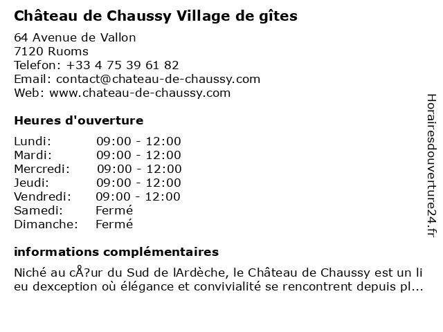 1 Le Village des Producteurs (Distance: 0,67 km) 23 Boulevard de l'Europe Unie, 07120 Ruoms des, le, le village, locaux, magasin, producteurs, produits, ruoms, village 2 Yelloh! Village - Aluna Vacances (Distance: 1,62 km) 900 Route de Lagorce, 07120 Ruoms aluna, vacances, village, yelloh! 3 Camping Homair - Domaine de Chaussy (Distance: 1,74 km) Petit Chaussy, 07150 Lagorce camping, camping 5 étoiles, camping 5 étoiles ardèche, camping 5 étoiles avec parc aquatique, camping 5 étoiles france, camping 5 étoiles rhône alpes, camping animations, camping ardèche, camping avec piscine, camping bord de rivière, camping campagne, camping club enfants, camping familiale ardèche, camping famille, camping france, camping montagne, camping proche d'un lac 5 étoiles, camping rhône alpes, camping rhône alpes parc aquatique, chaussy, de, domaine, homair, location de mobil-home 4 Camping Le Domaine de Chaussy (Distance: 5,40 km) - Route de Ruoms, 07150 Largorce-Vallon-Pont-d'Arc camping, chaussy, de, domaine, hebergement, le, tourisme 5 Camping Le Domaine de Chaussy (Réception) (Distance: 5,40 km) - Route de Ruoms, 07150 Largorce-Vallon-Pont-d'Arc camping, chaussy, de, domaine, hebergement, le, réception, tourisme 6 Château de la Selve - Eté (Distance: 6,51 km) - D111, 07120 Grospierres bio, château, coteaux, d'été, de, eté, gîtes, horaires, la, mai à septembre, selve, vins |