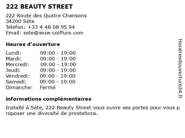 1 Beauty Success (Distance: 1,14 km) - boulevardd Camille Blanc, 34200 Sète beauty, beauté, parfumeries, santé, sport, success 2 Beauty Success (Distance: 1,47 km) 54 Boulevard Camille Blanc, 34200 Sète beauty, beauté, institut, success 3 Beauty Carlota (Distance: 2,96 km) 7 avenue Marx Dormoy, 34200 Sète beauty, beauté, carlota, esthétique, institut, salon 4 The Street Soccer (Distance: 8,22 km) . rue Georges Sand, 34110 Frontignan foot, intérieur, salle, soccer, sport, stade, street, the, tournoi 5 Wasabi - Asian Street Food (Distance: 16,54 km) - Route de Sète, 34300 Agde asian, cuisine, food, japonais, repas, spécialités, street, traiteur, wasabi 6 Beauty Success (Distance: 16,54 km) . Route de Sète, 34300 Agde accessoires, beauty, corps&bain, homme, parfum, parfumeries, success |