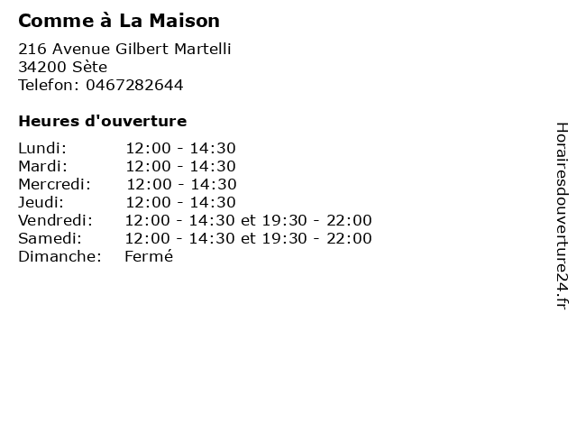 | Samedi | 12:00-14:30 et 19:30-22:00 |