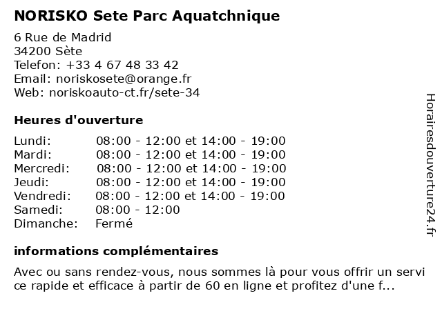 1 Norisko Auto Contrôle Di Pasquale (Distance: 6,64 km) 30 Impasse des Lauriers, 34560 Poussan auto, contrôle, di, norisko, pasquale 2 NORISKO PARC AQUATECHNIQUE SETE CONTROLE TECHNIQUE AUTO MOTO (Distance: 0,00 km) 6 Rue de Madrid, 34200 Sète 4x4, aquatechnique, auto, camping car, collection, controle, diesel, electrique, essence, gazole, moto, norisko, parc, scooter, sete, suv, technique, utilitaire, voiture, voiture sans permis 3 Nathalie Di Pirro - Sophrologue (Distance: 3,13 km) 4 rue des Sophoras, 34540 Balaruc-les-Bains di, nathalie, pirro, sante, soins, sophrologie, sophrologue 4 Sécuritest Contrôle Technique Automobile (Distance: 5,65 km) 50 Avenue de la Résistance, 34110 Frontignan automobile, centre contrôle technique, contre visite, contrôle, contrôle pollution, contrôle technique, contrôle technique automobile, securitest, sécuritest, technique, véhicules léger 5 Centre contrôle technique NORISKO (Distance: 6,64 km) 30 Impasse des Lauriers, 34560 Poussan 4x4, camping car, centre, collection, contrôle, diesel, electrique, essence, gazole, norisko, suv, technique, utilitaire, voiture 6 Centre contrôle technique NORISKO (Distance: 6,64 km) 30 Impasse des Lauriers, 34560 Poussan 4x4, camping car, centre, collection, contrôle, diesel, electrique, essence, gazole, norisko, suv, technique, utilitaire, voiture |