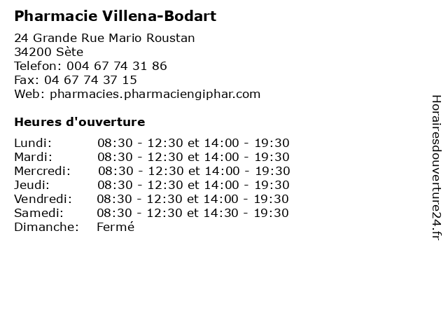 1 Pharmacie Villena Bodart (Distance: 0,01 km) 24 Grand Rue Mario Roustan, 34200 Sète bodart, herboristerie, médicaments, paramédical, parapharmacie, pharmacie, pharmacien, santé, traitements, villena 2 Pharmacie Millet-Nogué (Distance: 0,39 km) 14 Rue Honoré Euzet, 34200 Sète herboristerie, millet, médicaments, nogué, paramédical, parapharmacie, pharmacie, pharmacien, santé, traitements 3 Pharmacie Le Sausse (Distance: 0,46 km) 1 Rue Henri Barbusse, 34200 Sète herboristerie, le, médicaments, paramédical, parapharmacie, pharmacie, pharmacien, santé, sausse, traitements 4 Pharmacie des 4 Ponts (Distance: 0,51 km) 3 Place Delille, 34200 Sète des, herboristerie, médicaments, paramédical, parapharmacie, pharmacie, pharmacien, ponts, santé, traitements 5 Pharmacie du Pont Virla (Distance: 0,60 km) 30 Quai Maréchal de Lattre de Tassigny, 34200 Sète du, herboristerie, médicaments, paramédical, parapharmacie, pharmacie, pharmacien, pont, santé, traitements, virla 6 Pharmacie Victor Hugo (Distance: 0,72 km) 6 Avenue Victor Hugo, 34200 Sète herboristerie, hugo, médicaments, paramédical, parapharmacie, pharmacie, pharmacien, santé, traitements, victor |