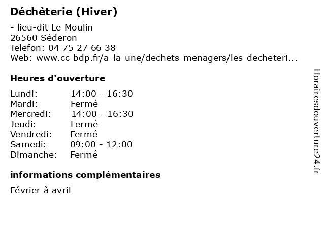 1 Déchèterie (Été) (Distance: 0,00 km) - lieu-dit Le Moulin, 26560 Séderon bennes, déchets, déchèterie, détritus, gravats, été 2 Déchèterie (Distance: 16,29 km) - Barret, 05300 Barret-sur-Méouge déchèterie, gravats, huiles usées, la réception des déchets et écocentres, les appareils électroménagers, les déchets verts, papier et carton en quantité 3 Déchèterie - Mi-Septembre à Mi-Mai (Distance: 19,67 km) - route départementale 51, 04150 Banon bennes, débarras, déchèterie, détritus, mai, mi, ordures, poubelles, septembre 4 Déchèterie - Mi-Mai à Mi-Septembre (Distance: 19,67 km) - route départementale 51, 04150 Banon bennes, débarras, déchèterie, détritus, mai, mi, ordures, poubelles, septembre 5 Déchèterie (Distance: 22,33 km) - Buis-les-Baronnies, 26170 Buis-les-Baronnies déchèterie, gravats, huiles usées, la réception des déchets et écocentres, les appareils électroménagers, les déchets verts, papier et carton en quantité 6 Déchèterie (Distance: 37,17 km) - Les Laurons, 26110 Nyons déchèterie, gravats, huiles usées, la réception des déchets et écocentres, les appareils électroménagers, les déchets verts, papier et carton en quantité |