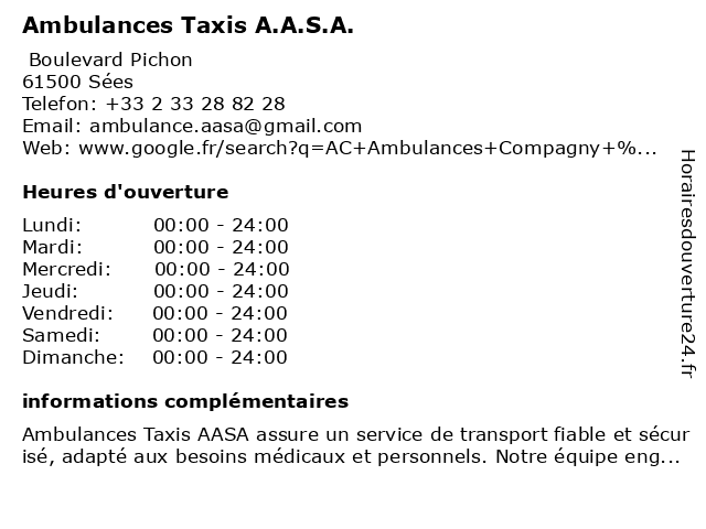 1 Taxis Des Sources (Distance: 11,55 km) 36 Place Maréchal Leclerc, 61570 Almenêches des, sources, taxis 3 Ambulances Courtioux (Distance: 19,17 km) 58 Avenue de Courteille, 61000 Alençon ambulances, courtioux 5 Harmonie Ambulance (Distance: 32,09 km) - Bellevue, 72600 Mamers agence, ambulance, ambulances, harmonie, médical, services, transports 6 |