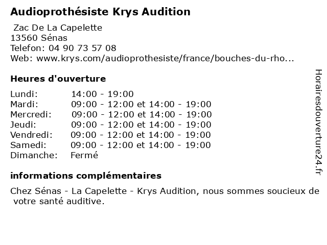 1 Audioprothésiste Krys Audition (Distance: 7,57 km) 55 Place Raoul Coustet, 13370 Mallemort audiologie, audioprothésiste, audition, krys 2 Audioprothésiste Krys Audition (Distance: 11,06 km) 48 Place Léon Gambetta, 84300 Cavaillon audiologie, audioprothésiste, audition, krys 3 Opticien Krys (Distance: 0,00 km) Zac De La Capelette, 13560 Sénas krys, magasin de lentilles correctrices, magasin de lunettes de soleil, magasin d’accessoires de mode, opticien, optométrie 4 Opticien Krys (Distance: 7,56 km) 55 Place Raoul Coustet, 13370 Mallemort krys, magasin de lentilles correctrices, magasin de lunettes de soleil, magasin d’accessoires de mode, opticien, optométrie 5 Inguimbert Optique - Krys (Distance: 7,59 km) . place Raoul Coustet, 13370 Mallemort accessoires, inguimbert, krys, lentilles, lunettes, myopie, opticien, optique, solaires 6 Audition Conseil (Distance: 10,86 km) 104 Avenue Gabriel Péri, 84300 Cavaillon auditif, audition, centre, conseil, mutualiste, santé |