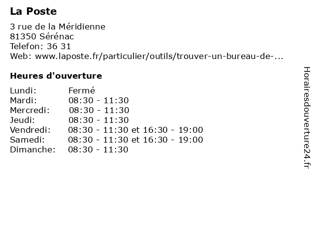 2 La Poste (Distance: 8,02 km) - Rue de la Poste, 81340 Valence-d'Albigeois agence, assurance, banque, banque postale, bureau de poste, chronopost, colis, courrier, dps, expéditions internationales, la, point, postale, poste, relais, timbres, téléphonie, ups, western union 3 La Poste (Distance: 10,33 km) - Rue Adrien Foures, 81160 Arthes colis, express chronopost, expédition, la, poste, réexpédition internationale, service, suivi du courrier 4 La Poste (Distance: 11,75 km) - Rue de l'Hôtel de Ville, 81340 Trébas agence, assurance, banque, banque postale, bureau de poste, chronopost, colis, courrier, dps, expéditions internationales, la, point, postale, poste, relais, timbres, téléphonie, ups, western union 5 La Poste (Distance: 12,66 km) 2 Route d'Albi, 81990 Frejairolles agence, assurance, banque, banque postale, bureau de poste, chronopost, colis, courrier, dps, expéditions internationales, la, point, postale, poste, relais, timbres, téléphonie, ups, western union 6 La Poste (Distance: 12,78 km) 17 Avenue d'Albi, 81250 Alban colis, express chronopost, expédition, la, poste, réexpédition internationale, service, suivi du courrier |