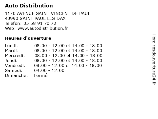 1 AD Auto Distribution (Distance: 0,79 km) 718 Avenue Du Marechal Foch, 40990 St Paul Les Dax ad, auto, automobiles, concessionnaire, distribution, garage, motos 2 AD Auto Distribution (Distance: 1,79 km) 100 Avenue Saint Vincent De Paul, 40100 Dax ad, auto, automobiles, concessionnaire, distribution, garage, motos 3 GEODIS | Distribution & Express - Agence de Dax (Saint Paul les Dax) (Distance: 3,41 km) 225 Rue Philibert Delorme, 40990 Saint-Paul-lès-Dax agence, dax, de, distribution, express, geodis, les, paul, saint 4 Station-Service Total - Elan Dussin Distribution (Distance: 6,98 km) 1941 Route de Tercis, 40180 Oeyreluy distribution, dussin, elan, essence, philippe, service, station, stations, total 5 AD Auto Distribution (Distance: 12,37 km) . Chemin de L'Herte, 40465 Pontonx sur L'Adour ad, auto, automobiles, concessionnaire, distribution, garage, motos 6 Côté Route Mores Pneus Saint-Paul-lès-Dax by First Stop (Distance: 0,15 km) 1046 Boulevard Saint-vincent-de-paul, 40990 Saint-Paul-Lès-Dax atelier d'usinage, by, côté, dax, first, lès, magasin de pièces automobiles, magasin de pneus, mores, paul, pneus, route, saint, station-service de changement de l'huile, stop |