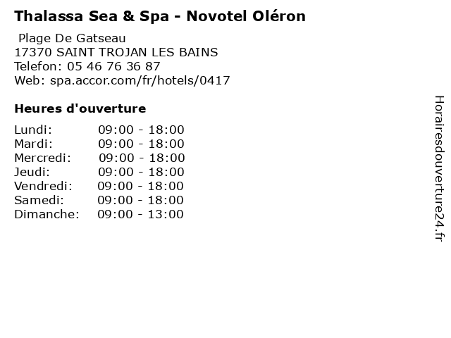 1 Novotel Thalassa Oléron Saint-Trojan (Distance: 0,01 km) Plage De Gatseau, 17370 Saint Trojan Les Bains novotel, oléron, saint, thalassa, trojan 2 Bel Hôtel Oléron Thalasso & Spa - MGallery (Distance: 0,02 km) Plage De Gatseau, 17370 Saint Trojan Les Bains bel, hôtel, mgallery, oléron, spa, thalasso 3 Arc en ciel Oléron - Village Vacance CAP France (Distance: 1,99 km) 1 allée Monplaisir, 17370 Saint-Trojan-Les-Bains arc, cap, ciel, en, france, hebergement, hotel, loisirs, oléron, tourisme, vacance, vacances, village 4 Hôtel de la Plage, Marennes Oléron, The Originals Relais (Distance: 4,63 km) 16 Avenue Gabrielle, 17390 La Tremblade de, hôtel, la, marennes, oléron, originals, plage, relais, the, tourisme 5 EHPAD L'Océane d'Oléron (Distance: 5,67 km) 1 allée des Pins, 17370 Le Grand-Village d'oléron, ehpad, foyer, hébergement, l'océane, médicalisé, retraite, vieillesse 6 Oléron STP (Distance: 8,42 km) - Petit Port des Seynes, 17320 Marennes enduits, fabrication, oléron, peinture, stp, vernis |
