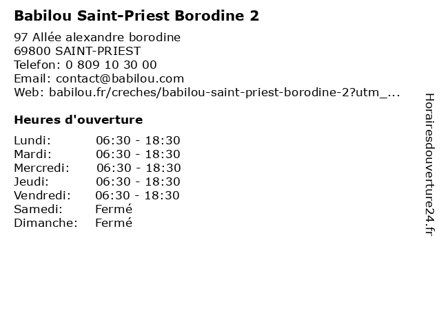 1 Babilou (Distance: 0,00 km) 97 Allée Borodine, 69800 Saint-Priest babilou, babysitting, crèches, garde d'enfants 2 Babilou (Distance: 0,10 km) . Allée Borodine, 69800 Saint-Priest babilou, babysitting, crèches, garde d'enfants 3 Micro-crèche Babilou Saint-Priest Woodclub (Distance: 0,14 km) 97 Allée Alexandre Borodine, 69800 Saint-Priest accueil, babilou, crèche, crèches, de, enfants, garde, garderie, halte-garderie, micro, micro-crèche, mode, multi-accueil, parents, priest, saint, woodclub 4 Babilou Saint-Priest Borodine 1 (Distance: 0,14 km) 97/273 Allée borodine, 69800 SAINT-PRIEST babilou, borodine, priest, saint 5 Crèche Léa et Léo - Le Jardin Magique - Babilou (Distance: 0,90 km) 9 Allée Irène Joliot Curie, 69800 Saint-Priest acceuil, babilou, creche, crèche, enfant, enfants, et, jardin, le, léa, léo, magique 6 Babilou (Distance: 7,27 km) 14 Espace Henry Vallée, 69007 Lyon babilou, babysitting, crèches, garde d'enfants |