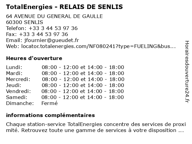 Termes de recherche pour TotalEnergies - RELAIS DE SENLIS:relais, de, total, senlis, gas station, station service, tankstelle, totalenergies |