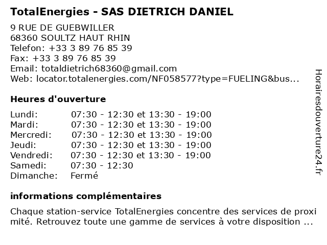 Termes de recherche pour TotalEnergies - SAS DIETRICH DANIEL:sas, total, daniel, gas station, dietrich, station service, tankstelle, totalenergies |