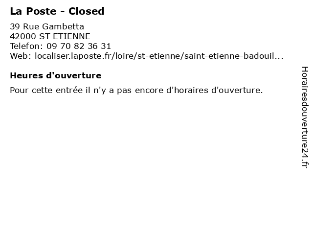 2 La Poste - Closed (Distance: 2,74 km) 62 Bd Alexandre De Fraissinette, 42100 Saint-Étienne closed, la, poste 3 La Poste - Closed (Distance: 4,89 km) Boulevard Aristide Briand, 42650 ST JEAN BONNEFONDS closed, la, poste 4 La Poste - Closed (Distance: 18,90 km) 38 Boulevard Des Provinces, 42800 RIVE DE GIER closed, la, poste 6 GANT St Etienne CLOSED (Distance: 0,37 km) 22 Rue Michelet, 42000 Saint Etienne closed, etienne, gant, magasin de vêtements pour hommes, st |