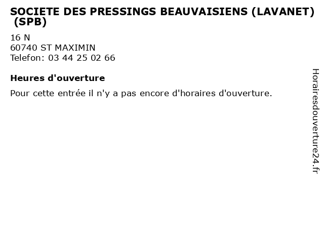 | Appeler SOCIETE DES PRESSINGS BEAUVAISIENS (LAVANET) (SPB) | |