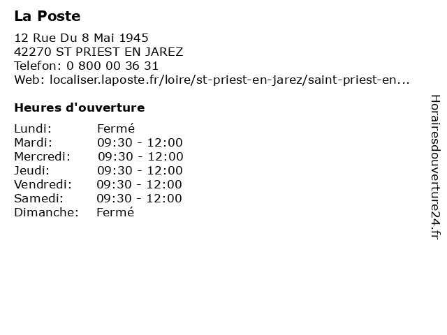 5 La Poste (Distance: 4,32 km) - Place Gambetta, 42350 La Talaudière agence, assurance, banque, banque postale, bureau de poste, chronopost, colis, courrier, dps, expéditions internationales, la, point, postale, poste, relais, timbres, téléphonie, ups, western union 6 La Poste (Distance: 6,26 km) - Place de la Mairie, 42570 Saint-Héand agence, assurance, banque, colis, courrier, envois, expéditions, la, point, postale, poste, relais |