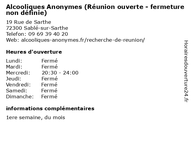 1 Alcooliques Anonymes (Réunion fermée - fermeture non définie) (Distance: 0,00 km) 19 Rue de Sarthe, 72300 Sablé-sur-Sarthe alcooliques, anonymes, définie, fermeture, fermée, non, réunion 2 Alcooliques Anonymes (Réunion fermée - fermeture non définie) (Distance: 37,14 km) - Square du Pont des Fées, 49150 Baugé en Anjou alcooliques, anonymes, définie, fermeture, fermée, non, réunion 3 Regus (Distance: 39,77 km) . Place du 8 Mai 1945, 72000 Le Mans location de bureaux, location salle de réunion, regus, services aux entreprises 4 Alcooliques Anonymes (Réunion fermée - fermeture non définie) (Distance: 41,75 km) - Rue de l'Alma, 53000 Laval alcooliques, anonymes, définie, fermeture, fermée, non, réunion 5 Alcooliques Anonymes (Réunion ouverte - fermeture non définie) (Distance: 41,75 km) - Rue de l'Alma, 53000 Laval alcooliques, anonymes, définie, fermeture, non, ouverte, réunion 6 Alcooliques Anonymes (Réunion ouverte - fermeture non définie) (Distance: 42,52 km) 24 Boulevard de la Fresnellerie, 72100 Le Mans alcooliques, anonymes, définie, fermeture, non, ouverte, réunion |