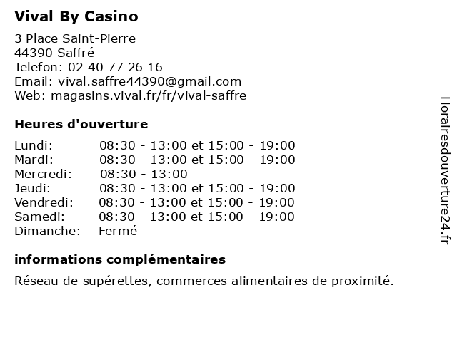 1 Vival By Casino (Distance: 10,93 km) 4 Route du Gavre, 44170 Vay alimentation, by, casino, distributeur alimentaire, supermarché, supérette, vival, épicerie 2 Vival By Casino (Distance: 14,74 km) - Allée des Jardins, 44520 La Meilleraye-de-Bretagne alimentation, by, casino, distributeur alimentaire, supermarché, supérette, vival, épicerie 3 Vival By Casino (Distance: 18,17 km) 20 Rue de la Mairie, 44590 Saint-Vincent-des-Landes alimentation, by, casino, distributeur alimentaire, supermarché, supérette, vival, épicerie 4 Vival by Casino (Distance: 18,85 km) 2 Rue de la Renaissance, 44290 Conquereuil by, casino, droguerie, d’hypermarchés, frais, fruits et légumes, hygiène, parfumerie et autres produits non alimentaires., surgelés, vival, épicerie 5 Vival (Distance: 12,99 km) 5 Place de la Mairie, 44390 Les Touches alimentation, distributeur alimentaire, supermarché, supérette, vival, épicerie 6 |