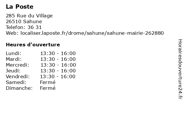 1 La Poste (Distance: 5,28 km) 3 Place du 19 Mars 1944, 26110 Condorcet agence, assurance, banque, banque postale, bureau de poste, chronopost, colis, courrier, dps, expéditions internationales, la, point, postale, poste, relais, timbres, téléphonie, ups, western union 2 La Poste (Distance: 7,06 km) 17 Avenue du Quai de l'Oule, 26510 Remuzat agence, assurance, banque, banque postale, bureau de poste, chronopost, colis, courrier, dps, expéditions internationales, la, point, postale, poste, relais, timbres, téléphonie, ups, western union 3 La Poste (Distance: 8,01 km) 80 Allée des Platanes, 26110 Sainte-Jalle agence, assurance, banque, banque postale, bureau de poste, chronopost, colis, courrier, dps, expéditions internationales, la, point, postale, poste, relais, timbres, téléphonie, ups, western union 4 La Poste (Distance: 13,47 km) 26 Rue du Bout du Monde, 26110 Venterol agence, assurance, banque, banque postale, bureau de poste, chronopost, colis, courrier, dps, expéditions internationales, la, point, postale, poste, relais, timbres, téléphonie, ups, western union 5 La Poste (Distance: 15,24 km) - Le Village, 05150 Valdoule agence, assurance, banque, banque postale, bureau de poste, chronopost, colis, courrier, dps, expéditions internationales, la, point, postale, poste, relais, timbres, téléphonie, ups, western union 6 |