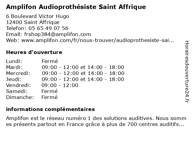 | 1 Amplifon (Distance: 0,50 km) 55 boulevard Emile Borel, 12400 Saint-Affrique amplifon, appareil, audioprothésiste, auditif, audition, centre, test 2 Audilab / Audioprothésiste Saint Affrique (Distance: 0,52 km) Place de la Gare, 12400 Saint-Affrique affrique, audilab, audioprothésiste, saint 3 Audilab / Audioprothésiste Camarès (Distance: 15,11 km) 32 chemin de la Noria Maison médicale, 12360 Camarès audilab, audioprothésiste, camarès 4 Amplifon Audioprothésiste Belmont-sur-Rance (Distance: 19,01 km) Maison De Santé De Belmont-sur-rance, 12370 Belmont-sur-Rance amplifon, audiologie, audioprothésiste, belmont, rance, sur 5 Amplifon Audioprothésiste Millau (Distance: 21,81 km) 14 Boulevard De L'ayrolle, 12100 Millau amplifon, audiologie, audioprothésiste, millau 6 Amplifon Audioprothésiste Baraqueville (Distance: 50,62 km) 367 Avenue Du Centre, 12160 Baraqueville amplifon, audiologie, audioprothésiste, baraqueville |