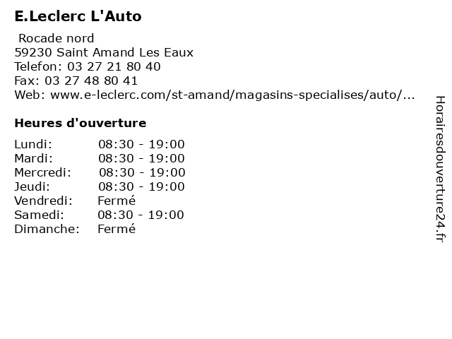 1 E.Leclerc L'Auto (Distance: 4,88 km) . Des Bruyeres, 59733 Saint Amand Les Eaux e.leclerc, l'auto, service, services, services à la personne 2 Leclerc - Borne de recharge électrique (Distance: 0,18 km) - Zone d'Activite Du Mont Des Bruyeres, 59230 Saint-Amand-les-Eaux borne, de, leclerc, recharge, électrique 3 E.Leclerc Parapharmacie (Distance: 0,32 km) Zone D Activite du Mont des Bruyeres Rocade Nord, 59230 Saint Amand Les Eaux e.leclerc, magasin de produits de soins capillaires, parapharmacie 4 E.Leclerc Brico (Distance: 0,32 km) Zone D Activite du Mont des Bruyeres Rocade Nord, 59230 Saint Amand Les Eaux brico, e.leclerc, fabricant d'abris de jardin, fabricant de garages, fournisseur de bois de chauffage, magasin de fournitures pour piscines, plantes d?intérieur, système d?arrosage de la pelouse, vente de tondeuses à gazon 5 E.Leclerc Voyages (Distance: 0,64 km) . Monts Des Bruyères, 59230 Saint-Amand-les-Eaux e.leclerc, leclerc, location, réservation, séjours, voyages 6 E.Leclerc Saint Amand (Distance: 0,76 km) - Zone d activite du mont des bruyeres, 59230 Saint Amand Les Eaux amand, e.leclerc, saint, supermarchés |