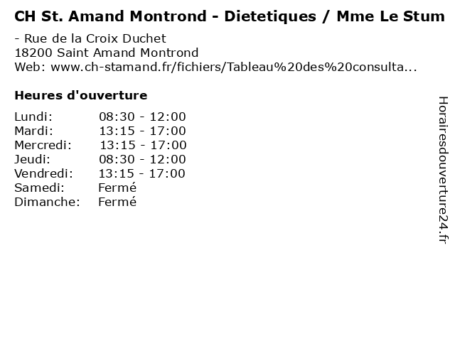 Termes de recherche pour CH St. Amand Montrond - Dietetiques / Mme Le Stum:le, amand, montrond, bureau, med, medecine, maladie, mme, st., ch, traitement, médecin, consultation, dr, pratique, therapie, dietetiques, stum |