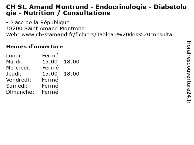 1 CH St. Amand Montrond - Endocrinologie - Diabetologie - Nutrition / Consultations (Distance: 0,86 km) 44 Avenue Jean Jaurès, 18200 Saint Amand Montrond amand, bureau, ch, consultation, consultations, diabetologie, dr, endocrinologie, maladie, med, montrond, médecin, médecine, nutrition, pratique, st., thérapie, traitement 2 CH St. Amand Montrond - Endocrinologie - Diabetologie - Nutrition / Consultations (Distance: 0,92 km) - Rue de La Fontaine Saint Martin, 18200 Saint Amand Montrond amand, bureau, ch, consultation, consultations, diabetologie, dr, endocrinologie, maladie, med, montrond, médecin, médecine, nutrition, pratique, st., thérapie, traitement 3 CH St. Amand Montrond - Endocrinologie - Diabetologie - Nutrition / Consultations (Distance: 1,38 km) - Rue de la Croix Duchet, 18200 Saint Amand Montrond amand, bureau, ch, consultation, consultations, diabetologie, dr, endocrinologie, maladie, med, montrond, médecin, médecine, nutrition, pratique, st., thérapie, traitement 4 CH St. Amand Montrond - Endocrinologie - Diabetologie - Nutrition / Consultations (Distance: 1,51 km) 11 Avenue de la Gare, 18200 Orval amand, bureau, ch, consultation, consultations, diabetologie, dr, endocrinologie, maladie, med, montrond, médecin, médecine, nutrition, pratique, st., thérapie, traitement 5 CH St. Amand Montrond - Cardiologie / Consultations (Distance: 0,00 km) - Place de la République, 18200 Saint Amand Montrond amand, bureau, cardiologie, ch, consultation, consultations, dr, maladie, med, montrond, médecin, médecine, pratique, st., thérapie, traitement 6 CH St. Amand Montrond - Cardiologie / Echocardiographies (Distance: 0,00 km) - Place de la République, 18200 Saint Amand Montrond amand, bureau, cardiologie, ch, consultation, dr, echocardiographies, maladie, med, montrond, médecin, médecine, pratique, st., thérapie, traitement |