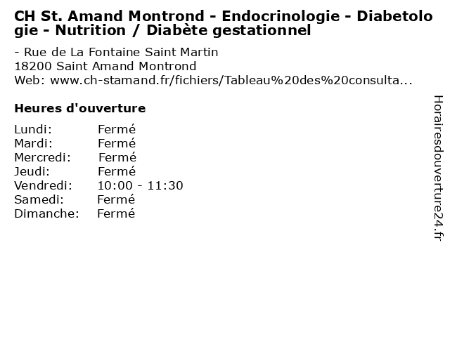 1 CH St. Amand Montrond - Endocrinologie - Diabetologie - Nutrition / Diabète gestationnel (Distance: 0,92 km) - Place de la République, 18200 Saint Amand Montrond amand, bureau, ch, consultation, diabetologie, diabète, dr, endocrinologie, gestationnel, maladie, med, montrond, médecin, médecine, nutrition, pratique, st., thérapie, traitement 2 CH St. Amand Montrond - Endocrinologie - Diabetologie - Nutrition / Diabète gestationnel (Distance: 1,53 km) 44 Avenue Jean Jaurès, 18200 Saint Amand Montrond amand, bureau, ch, consultation, diabetologie, diabète, dr, endocrinologie, gestationnel, maladie, med, montrond, médecin, médecine, nutrition, pratique, st., thérapie, traitement 3 CH St. Amand Montrond - Endocrinologie - Diabetologie - Nutrition / Diabète gestationnel (Distance: 2,08 km) 11 Avenue de la Gare, 18200 Orval amand, bureau, ch, consultation, diabetologie, diabète, dr, endocrinologie, gestationnel, maladie, med, montrond, médecin, médecine, nutrition, pratique, st., thérapie, traitement 4 CH St. Amand Montrond - Endocrinologie - Diabetologie - Nutrition / Diabète gestationnel (Distance: 2,25 km) - Rue de la Croix Duchet, 18200 Saint Amand Montrond amand, bureau, ch, consultation, diabetologie, diabète, dr, endocrinologie, gestationnel, maladie, med, montrond, médecin, médecine, nutrition, pratique, st., thérapie, traitement 5 CH St. Amand Montrond - Cardiologie / Consultations (Distance: 0,00 km) - Rue de La Fontaine Saint Martin, 18200 Saint Amand Montrond amand, bureau, cardiologie, ch, consultation, consultations, dr, maladie, med, montrond, médecin, médecine, pratique, st., thérapie, traitement 6 CH St. Amand Montrond - Cardiologie / Echocardiographies (Distance: 0,00 km) - Rue de La Fontaine Saint Martin, 18200 Saint Amand Montrond amand, bureau, cardiologie, ch, consultation, dr, echocardiographies, maladie, med, montrond, médecin, médecine, pratique, st., thérapie, traitement |