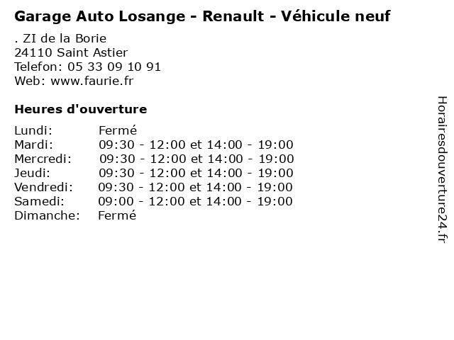 1 Garage Auto Losange - Renault Minute Service (Distance: 0,82 km) . Zone Industrielle La Borie, 24110 Saint Astier auto, automobile, garage, losange, minute, rapide, renault, réparation, service 2 Renault - Borne de Recharge Electrique (Distance: 0,92 km) 2 Impasse des Glaneurs, 24110 Saint-Astier borne, de, electrique, recharge, renault, électrique 3 RENAULT LALANDE AUTOMOBILE AGENT (Distance: 11,53 km) 4 Allée des Catalpas, 24650 Chancelade agent, automobile, lalande, renault 4 Tabac Le Pont Neuf (Distance: 15,14 km) 5 Rue Pierre Magne, 24000 Périgueux jeux, le, librairie, loto, neuf, papeterie, pont, presse, tabac 5 Garage Durand Jean-Pierre - Renault (Distance: 16,57 km) 207 boulevard du Petit Change, 24000 Périgueux atelier, automobile, durand, entretien, garage, jean, pierre, renault, reparation, vente 6 Faurie 24 - Renault Trucks (Distance: 16,61 km) . rue Jules Supervielle, 24330 Boulazac-Isle-Manoire 24, camion, entretien, faurie, garage, lourds, renault, réparation, truck, trucks, vente |