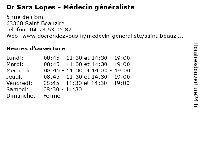 | Lundi | 08:45-11:30 et 14:30-19:00 |