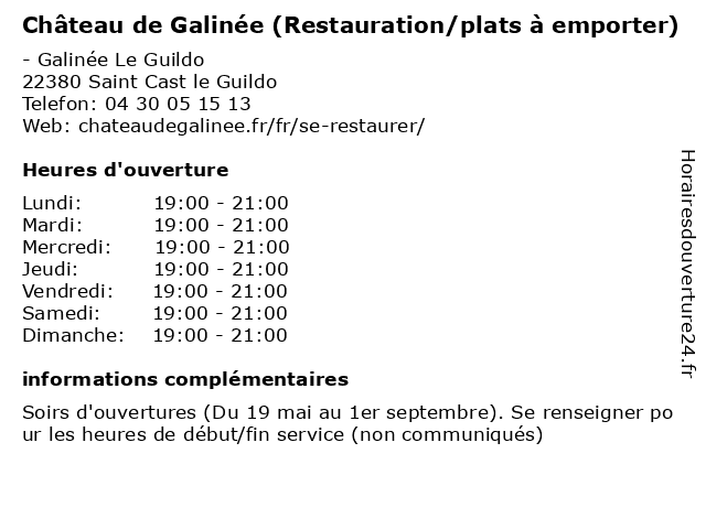 1 Château de Galinée (Restaurant) (Distance: 0,00 km) - Galinée Le Guildo, 22380 Saint Cast le Guildo camping, château, de, galinée, hebergement, restaurant, restauration, tourisme 2 Camping Château de Galinée (Distance: 0,53 km) - La Galinée, 22380 St. Cast-le-Guildo camping, centre de vacances, château, de, galinée, hébergements, location, tourisme 3 Camping Château de Galinée - Erquy (Réception, haute saison) (Distance: 4,91 km) - Le Guildo, 22380 Saint Cast le Guildo camping, château, de, erquy, galinée, haute, hebergement, réception, saison, tohapi, tourisme 4 Camping Château de Galinée - Erquy (Distance: 4,91 km) - Le Guildo, 22380 Saint Cast le Guildo camping, château, de, erquy, galinée, hebergement, tohapi, tourisme 5 Château de la Hunaudaye - Du 2 avril au 30 juin (Distance: 10,39 km) 16 Des Bois, 22270 Plédéliac 30, ancien, art, au, avril, chateau, château, de, du, et, exposition, histoire, hunaudaye, juin, la, livre, monument, musee, musée, office 6 Château de la Hunaudaye - Du 2 avril au 30 juin (Distance: 10,39 km) 16 Des Bois, 22270 Plédéliac 30, ancien, art, au, avril, chateau, château, de, du, et, exposition, histoire, hunaudaye, juin, la, livre, monument, musee, musée, office |