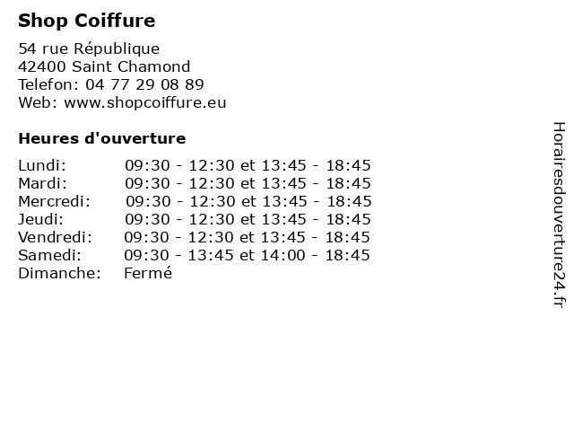 1 Shop Coiffure (Distance: 8,63 km) . Rue Saint Jean, 42100 Saint Etienne beauté, coiffeur, coiffure, services, shop 2 Shop Coiffure (Distance: 10,37 km) - Rue Saint Jean, 42100 Saint Etienne aménagement de la maison, beauté, coiffeur, coiffure, equipement de la maison, maquillage, parfumerie, services, services à la personne, shop, soins 3 Shop Coiffure (Distance: 19,28 km) 68 Boulevard Fayol, 42700 Firminy beauté, coiffeur, coiffure, services, shop 4 Océane Coiffure (Distance: 0,19 km) 9 Rue Ventefol, 42400 Saint-Chamond beauté, coiffeur, coiffure, institut, océane 6 Coiffure Calvin V by Géraldine (Distance: 0,41 km) 8 rue victor hugo, 42400 Saint-Chamond by, calvin, coiffeur, coiffure, femme, géraldine, homme |