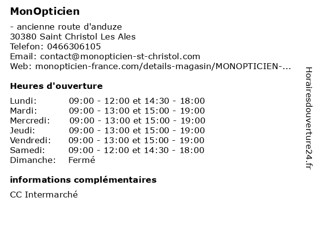 1 MonOpticien (Distance: 38,08 km) 42 Rue Du Forez, 30000 Nîmes accessoires, boutique, lunettes, monopticien, opticien, optique 2 MonOpticien Mas Drevon (Distance: 56,84 km) 164 Boulevard Pedro De Luna, 34000 Montpellier accessoires, boutique, drevon, lunettes, mas, monopticien, opticien, optique 3 Boucherie Chapel (Distance: 1,23 km) 9 Avenue du Général de Gaulle, 30380 Saint-Christol-lès-Alès boucherie, boutique, chapel, saint-christol-lès-alès, traiteur, viande 4 Le Duplex (Distance: 3,58 km) 1585 quai du Mas d'Hours, 30100 Alès boutique, duplex, le, magasin, mode, prêt à porter, vetements 5 Opticien Alès | Alain Afflelou (Distance: 3,72 km) 1341 Quai Du Mas D'hours, 30100 Alès afflelou, alain, alès, cabinet d'ophtalmologie, magasin de lunettes de soleil, ophtalmologie, opticien, optométrie 6 Opticien ALES Générale d'Optique (Distance: 3,81 km) 1341 Quai du Mas d'Hours, 30100 Alès ales, d'optique, examen de la vue, générale, lentilles de contact, lentilles progressives, lunette ray ban, lunettes, lunettes anti-lumière bleue, lunettes de conduite de nuit, lunettes de conduites de nuit, lunettes de soleil, lunettes de soleil pour enfant, lunettes de soleil pour femme, lunettes de soleil pour homme, lunettes de vue, lunettes de vue femme, lunettes de vue homme, lunettes progressives, opticien, opticien proche de chez moi, optique, sport à la vue, vérification de la vue |