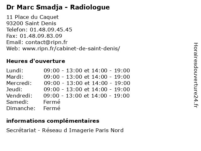 1 Dr Marc Smadja - Radiologue (Distance: 2,07 km) 35 Rue d'Amiens, 93240 Stains consultation, docteur, dr, marc, med, médecin, médecine, radiologue, smadja, traitement 2 Dr Marc Smadja - Radiologue (Distance: 3,22 km) 21 Rue du Commandant Louis Bouchet, 93800 Épinay-sur-Seine consultation, docteur, dr, marc, med, médecin, radiologue, smadja, traitement 3 Dr Marc Smadja - Radiologue (Distance: 3,50 km) 7 Avenue Gabriel Péri, 93400 Saint-Ouen consultation, docteur, dr, marc, med, médecin, médecine, radiologue, smadja, traitement 4 Dr Marc Smadja - Radiologue (Distance: 4,67 km) 108 Rue du Ruisseau, 75018 Paris consultation, docteur, dr, marc, med, médecin, radiologue, smadja, traitement 5 Dr Marc Smadja - Radiologue (Distance: 4,72 km) 4 Rue Gustave Rouanet, 75018 Paris consultation, docteur, dr, marc, med, médecin, médecine, radiologue, smadja, traitement 6 Dr Marc Smadja - Radiologue (Distance: 5,14 km) 83 Rue de l'Ourcq, 75019 Paris consultation, docteur, dr, marc, med, médecin, radiologue, smadja, traitement |