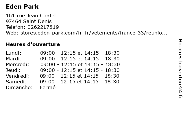1 Eden Park (Distance: 0,17 km) 104 rue Jean Chatel, 97400 Saint-Denis accessoires, eden, habillement, mode, park, vetement 2 Eden Park (Distance: 0,27 km) 64, rue Maréchal Leclerc, 97465 Saint Denis accessoires, eden, femme, homme, mode, park, vêtements 3 Eden Park (Distance: 17,91 km) 25 rue François de Mahy, 97420 Le Port accessoires, eden, femme, homme, mode, park, vêtements 4 Clinique Vétérinaire de la Montagne - Luna Park (Distance: 2,80 km) 24 bis Chemin Hautbois, 97417 Saint-Denis clinique, de, la, luna, montagne, park, vétérinaire 5 Dr Mira Park - Pédiatre (Distance: 17,37 km) 16 Rue Joseph Say, 97420 Le Port dr, enfant, mira, park, pediatre, pédiatre, sante, soins 6 Eden Vert 3D (Distance: 21,04 km) 3 impasse Bello Visto, 97460 Saint Paul 3d, agence, dératisation, eden, entretien, nuisibles, services, vert |