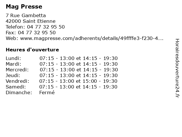 1 Mag Presse (Distance: 1,30 km) 48 Rue De La Montat, 42100 Saint-Etienne mag, magazine, presse, services 2 Mag Presse (Distance: 1,72 km) 3 Rue E. Charpentier, 42000 Saint Etienne mag, magazine, presse, services 3 Mag Presse (Distance: 7,13 km) . Du Berland, 42230 Saint Victor Sur Loire mag, magazine, presse, services 4 Studio Mag (Distance: 1,30 km) 30 Rue du Brûle, 42100 Saint-Étienne d'enregistrement, mag, musicale, production, studio, studios 5 Bar Tabac Presse (Distance: 1,97 km) 99 rue Richelandière, 42100 Saint-Etienne bar, barthelemy, fdj, pmu, presse, tabac 6 Presse Tabac (Distance: 2,19 km) . De Monthieu, 42030 St. Etienne beaute, cafe, chaussures, enfants, maison, mode femmes, mode hommes, presse, restaurant, sport, tabac |