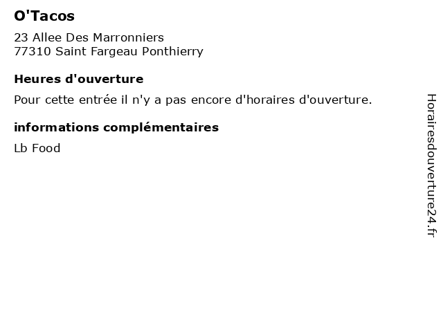 1 O'Tacos (Distance: 12,98 km) 2bis Rue Père André Jarlan, 91000 Évry-Courcouronnes aea, boissons, collations, o'tacos, restaurants, tacos 2 New School Tacos (Distance: 8,11 km) 37 Route départementale 306, 77240 Vert-Saint-Denis fast food, menus, new, repas, restaurant, school, tacos 3 O’ Tacos (Distance: 9,06 km) 29 Rue Saint-Barthélémy, 77000 Melun boissons, nourriture, o’, restaurant, service, tacos 4 La Maison du Tacos (Distance: 9,70 km) 21 Rue Saint Spire, 91100 Corbeil Essonnes bar, bistro, bistrot, brasserie, café, du, la, maison, pub, restaurant, restauration, resto, tacos 5 Enjoy Tacos - Ris Orangis (Distance: 16,71 km) 26 Rue Albert Rémy, 91130 Ris-Orangis enjoy, orangis, restaurant mexicain, ris, tacos 6 The Tacos Grill (Distance: 17,36 km) 8 Place Du 8 Mai 1945, 91700 Fleury Merogis ela, food, grill, restaurants, tacos, the |